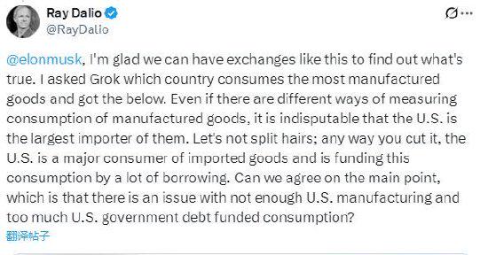 达利欧回应马斯克说:“我很高兴我们能通过这样的交流来探寻真相。我向Grok询问哪个国家消费的制造品最多,并得到了如下信息。尽管衡量制造品消费的方式可能不同,但有一点无可争议:美国是全球最大的制造品进口国。我们就别纠结细节了,无论怎么衡量,美国都是进口商品的主要消费国,而且这种消费很大程度上是靠借债来支撑的。我们是否可以就一个核心问题达成共识——那就是:美国制造能力不足,而政府举债驱动的消费又过多,这是一个亟待解决的问题?”