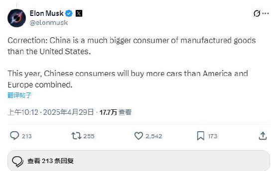 马斯克迅速反驳了达利欧的一个核心观点。他写道:“更正:中国是一个比美国大得多的制成品消费国。今年,中国消费者购买的汽车将超过美国和欧洲的总和。”