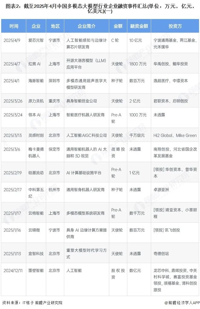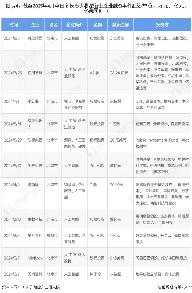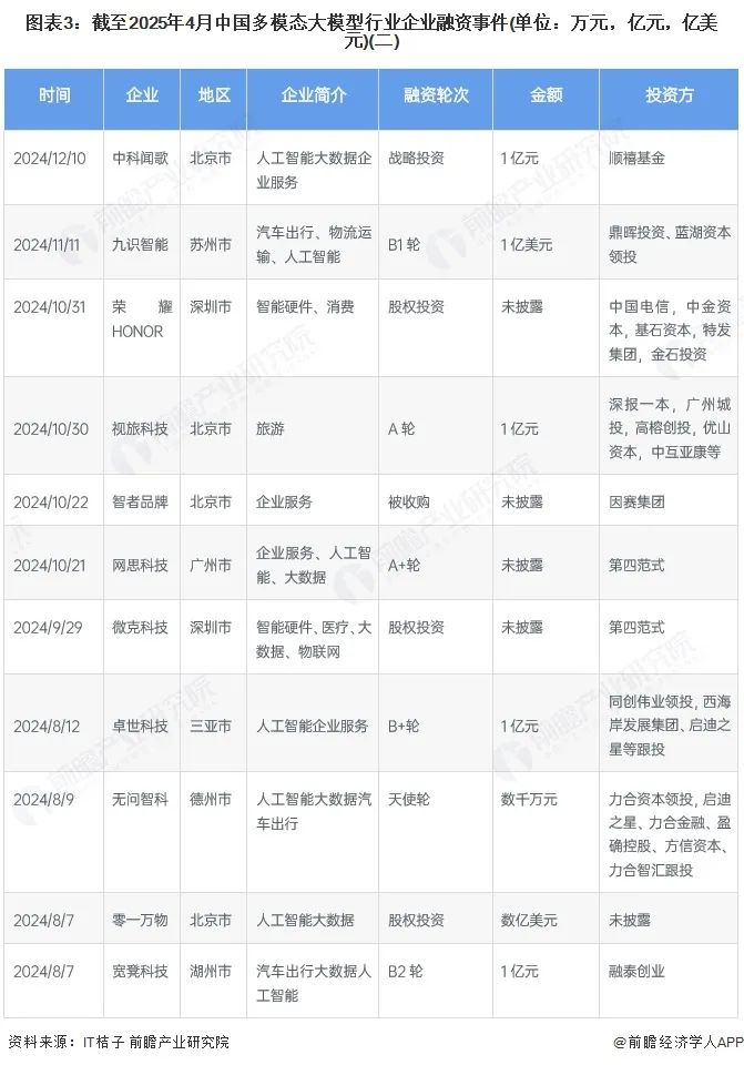 根据IT桔子显示,多模态大模型行业2025年开始投融资恢复热度。主要的融资事件如下:
