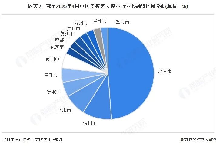 根据企业投融资目的地来看,目前行业内资金主要流向北京,占全部项目的一半。其次是深圳,占比10%,上海占比8%。北京具有良好的互联网科技、人工智能产业发展基础,企业对于多模态大模型需求较高,投资吸引力强。此外还有宁波、三亚、苏州三市的项目,这些地方具有较好的营商环境。