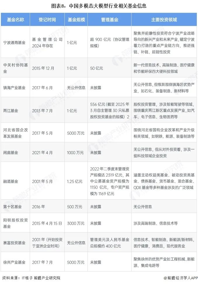 目前投资多模态大模型行业基金有宁波通商基金、中关村协同基金、镇海产业基金、两江基金、河北省国企改革发展基金、闲庭基金、融道基金、第十区基金、阳明股权投资基金、赛富投资基金、徐州产业基金。基金规模上亿元。