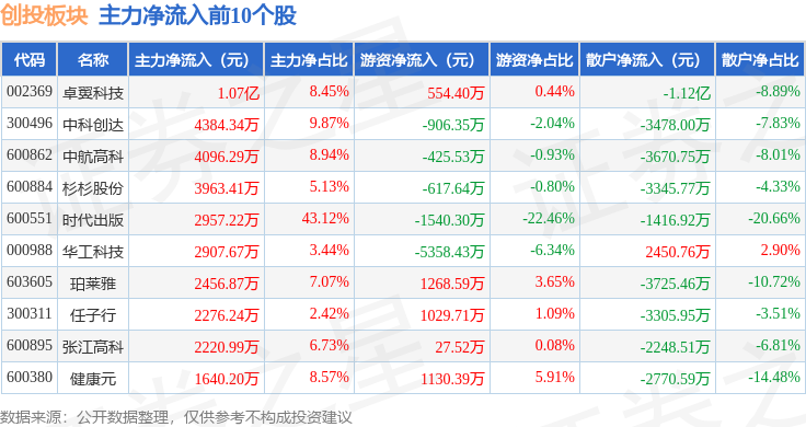 从资金流向上来看,当日创投板块主力资金净流出12.36亿元,游资资金净流入1.8亿元,散户资金净流入10.56亿元。创投板块个股资金流向见下表: