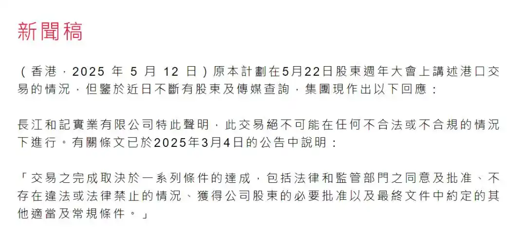 之后就是中美博弈局势逐渐清晰,关税战阶段性暂停,李嘉诚再次闻风而动,才有了如今的一纸公告。