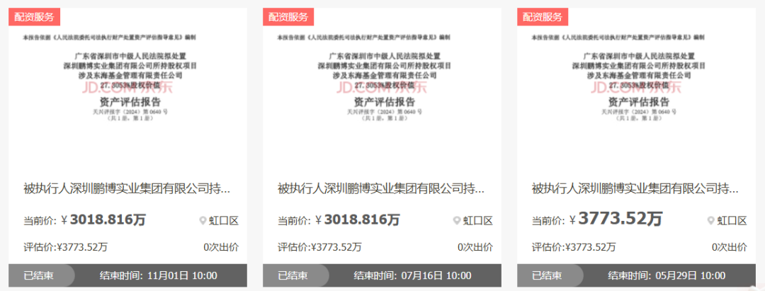 由于被执行人并未履行生效法律文书确定的义务,深圳中院依法冻结了鹏博实业持有的东海基金27.3053%的股权。同时,为实现债权利益最大化,此前被执行人鹏博实业持有的东海基金27.3053%的股权被拆分为两部分进行变卖,分别是22.6027%和4.7026%的股权。