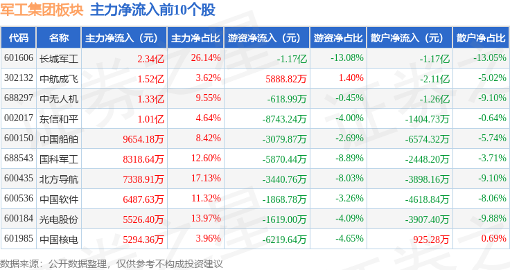 从资金流向上来看,当日军工集团板块主力资金净流入1.03亿元,游资资金净流入6348.82万元,散户资金净流出1.66亿元。军工集团板块个股资金流向见下表: