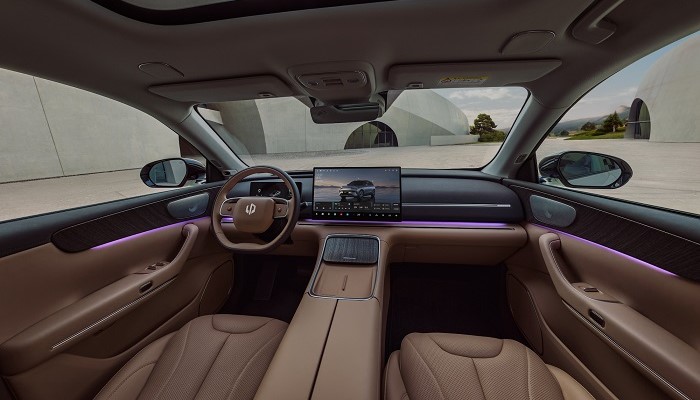 座舱大幅精简物理按键,配备双辐平底方向盘及17.3英寸窄边框中控屏,搭载高通骁龙8295芯片与Leapmotor OS 4.0系统,支持3D交互桌面及多屏协同。副仪表台重构后增设香氛系统及隐藏储物空间,内饰新增棕、灰配色。